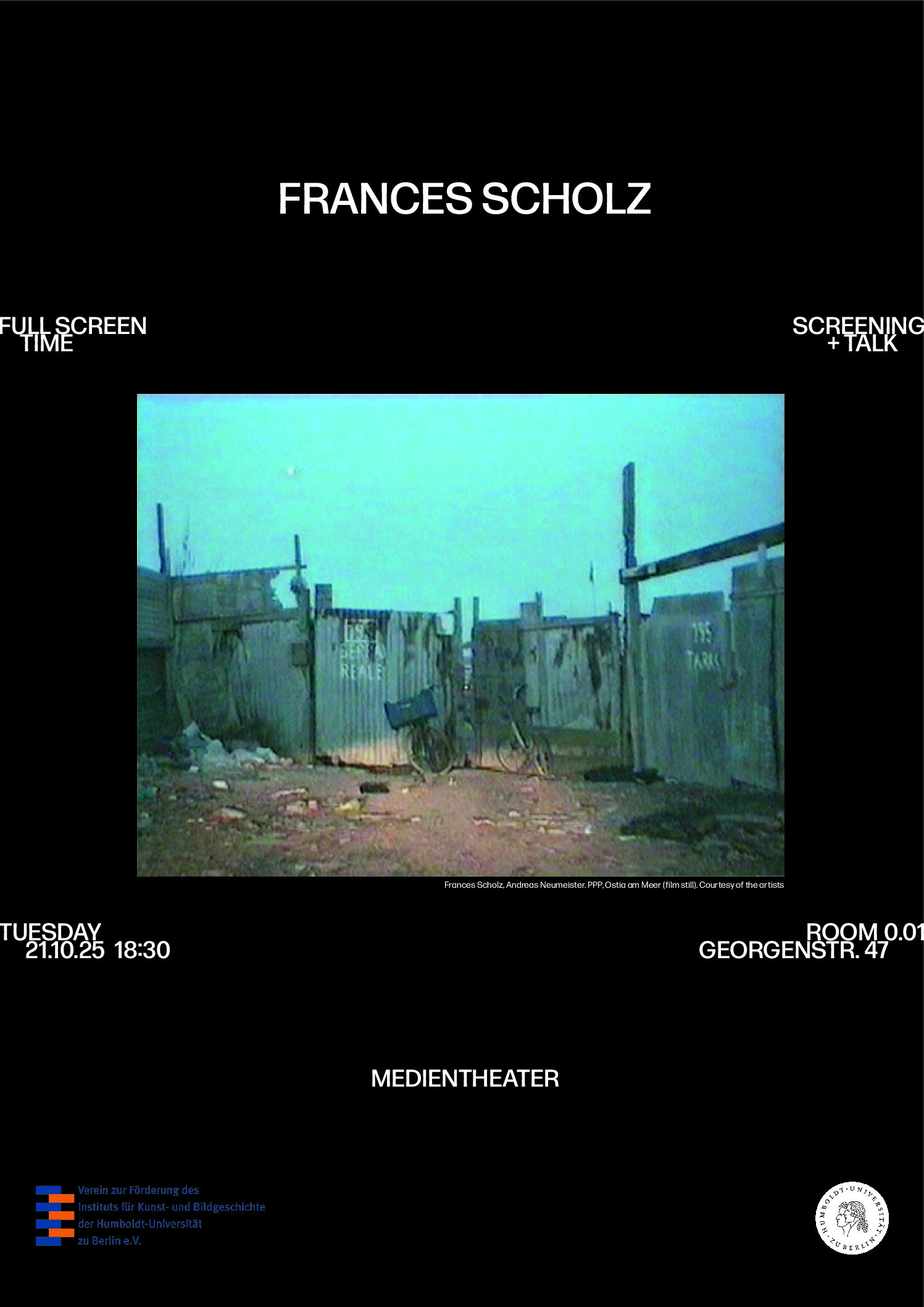 Die kommende Full-Screen-Time widmet sich anhand dreier Arbeiten Scholz‘ der Frage, wie im persönlichen Andenken und in kollektiven Erinnerungskulturen das Nachleben Kulturschaffender und ihrer Werke filmisch wiedergegeben und reflektiert werden können. So widmet sich das bereits 1999 in Zusammenarbeit mit Andreas Neumeister entstandene Werk P.P.P., Ostia am Meer dem römischen Vorort, in dem Pier Paolo Pasolini 1975 ermordet wurde. Sein Tod jährt sich nur wenige Tage nach dem Screening zum 50. Mal. Anschließend zeigen wir zwei Filme ihres gemeinsam mit Aura Rosenberg erarbeiteten Projekts Berlin Childhood – benannt nach Walter Benjamins Texten aus den 1930er Jahren. In Portbou (2017) und Two Brass Bands (2022) begleiten wir Benjamins Urenkelin Lais Benjamin zwischen dem für Walter Benjamin errichteten Gedenkort Passagen in Portbou und ihrer Berliner Kindheit zwischen Spielplatz und Eislaufbahn, wo sie die rückblickenden Beschreibungen ihres Urgroßvaters aktualisiert.Wir freuen uns sehr, Sie und Euch auch im Wintersemester 2025/2026 zu einer weiteren Veranstaltung der Reihe Full-Screen-Time einladen zu können, in der mit zeitbasierten Medien arbeitende Künstler:innen ausgewählte Werke zeigen und im Gespräch vorstellen. Am 21. Oktober 2025 um 18:30 Uhr wird Frances Scholz unsere Gästin sein. Die Veranstaltung findet wie gewohnt im Medientheater der Humboldt-Universität, im Erdgeschoss des Institutsgebäudes in der Georgenstr. 47, statt.